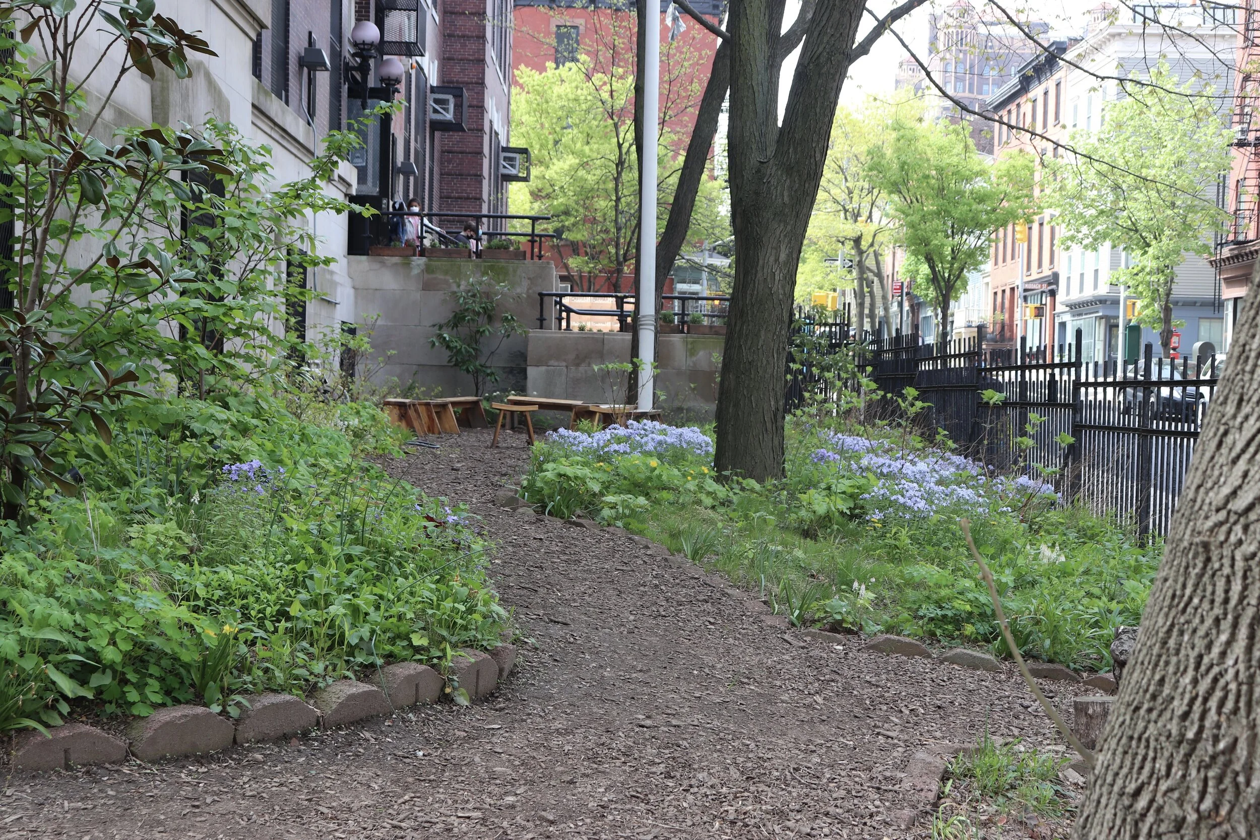 Brooklyn’s PS8 had an unused patch of bare turf and a passionate PTA. We worked together with a small army of 3rd graders to install a native plant garden surrounding a woodland gathering place.